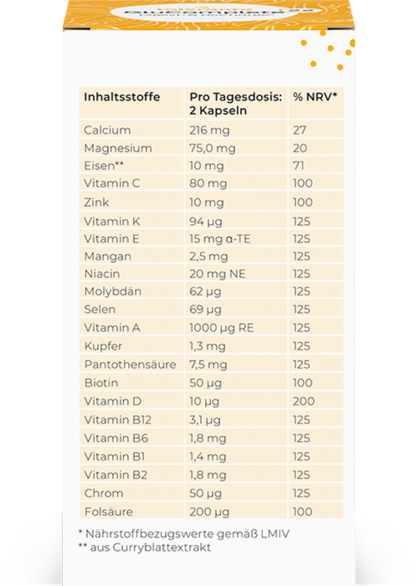Sinnvoll ausgewogene Dosierung – nicht zu viel, nicht zu wenig. GluComplete 22 orientiert sich an tatsächlichen Bedarfslücken statt an Maximal-Dosierungen ohne klinischen Nutzen.